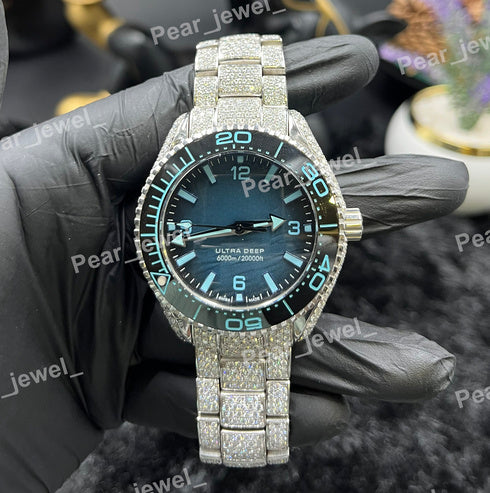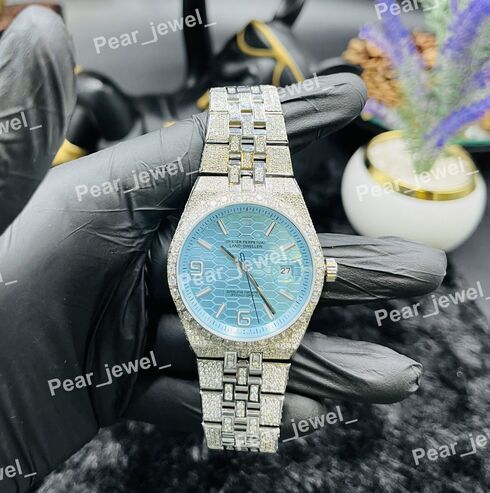 Iced Out Luxury Moissanite Diamond Blue Dial Wrist Watch For Man