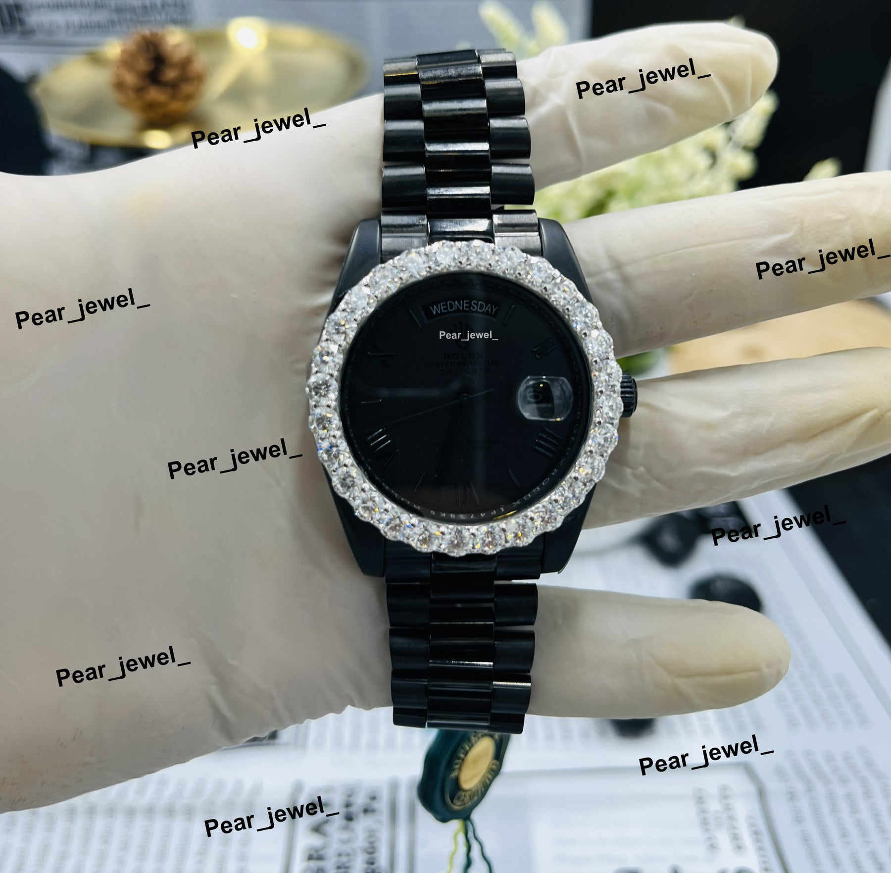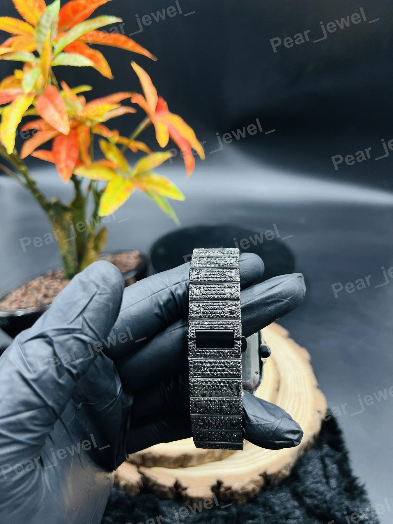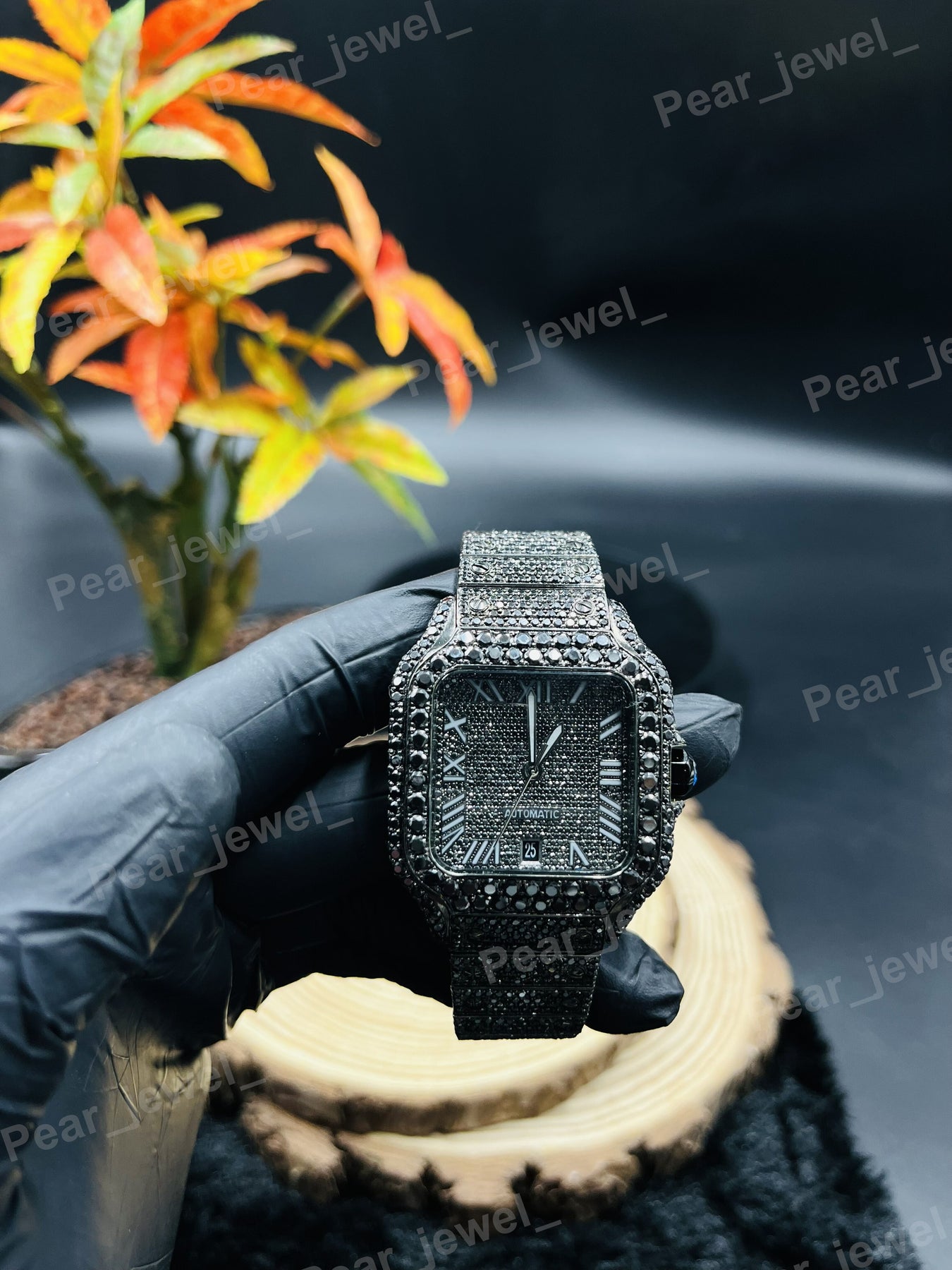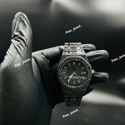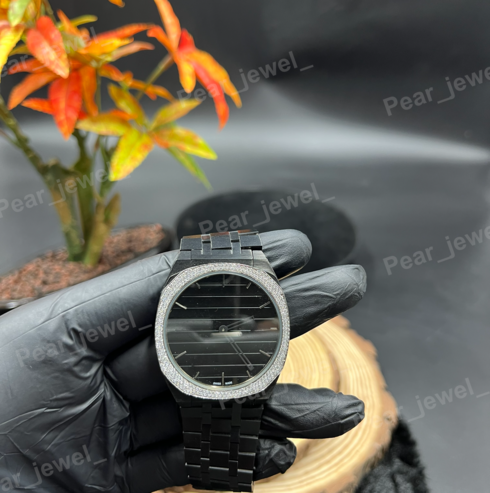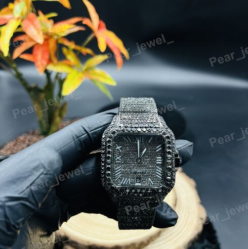 Iced Out Black Watch Moissanite Diamond Look Bezel Stainless Steel Wrist Watch