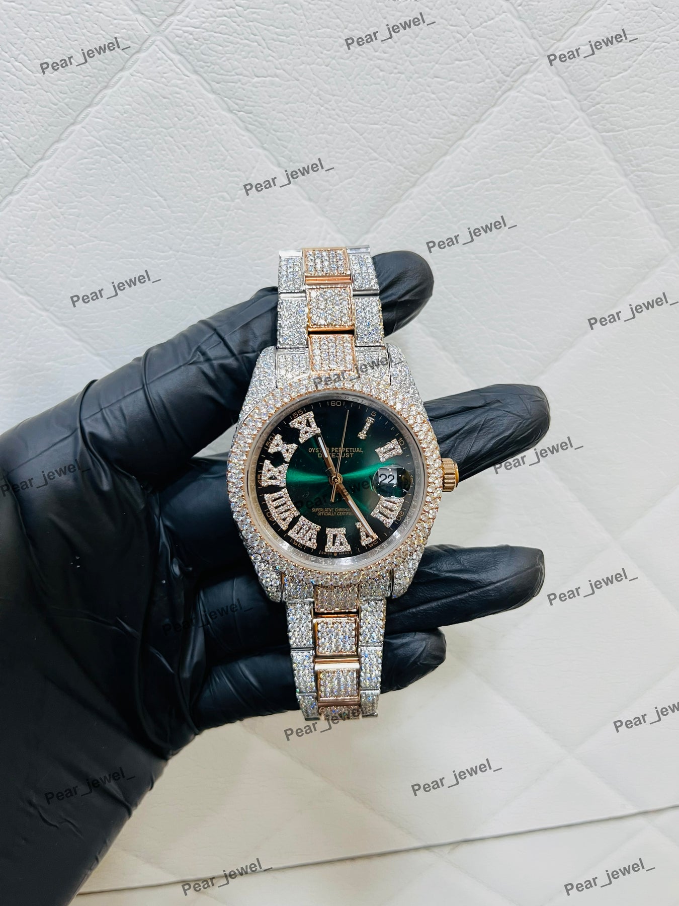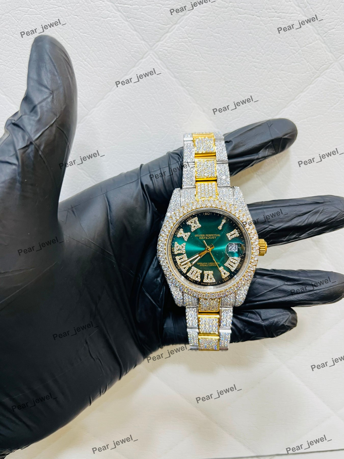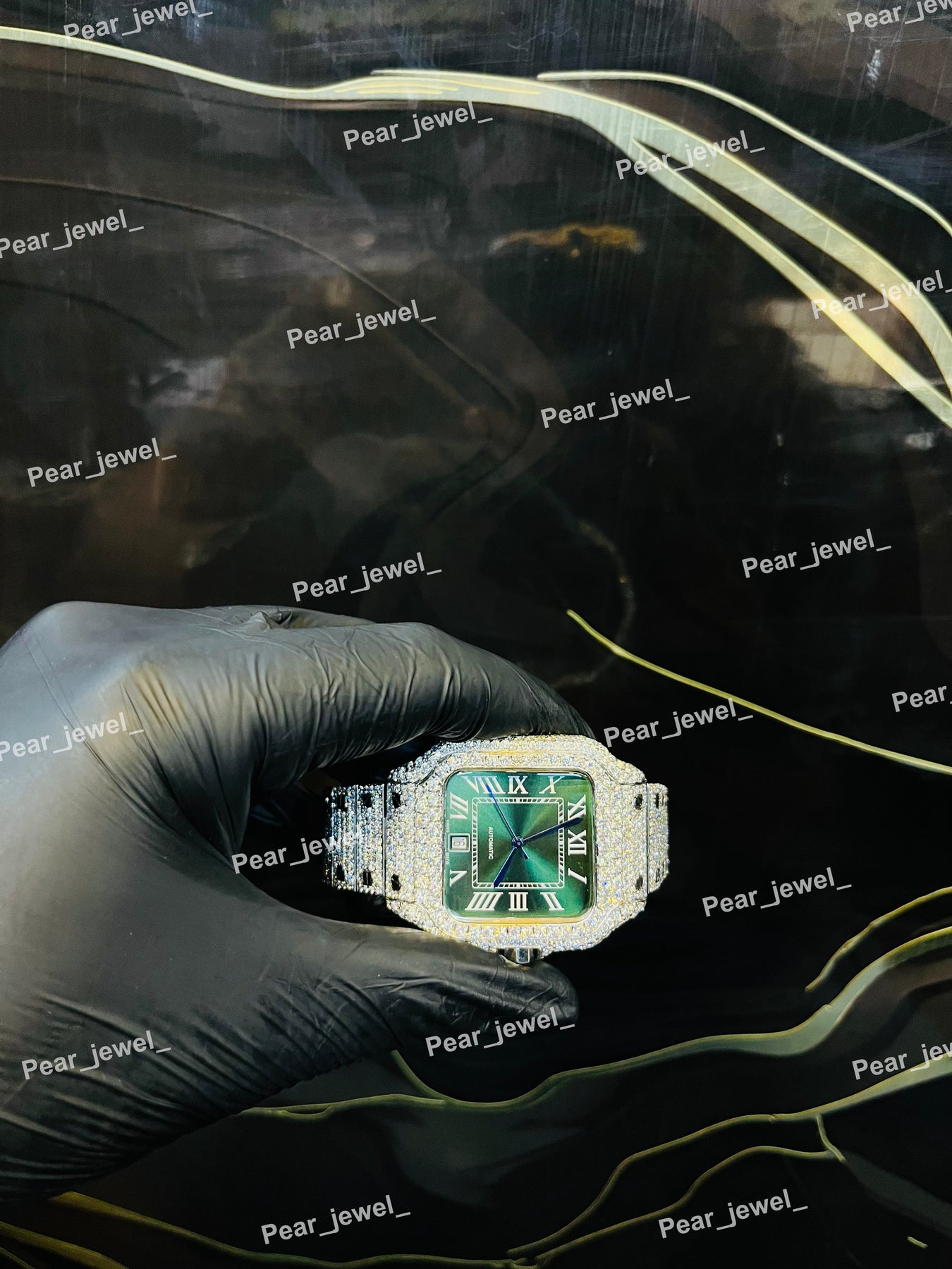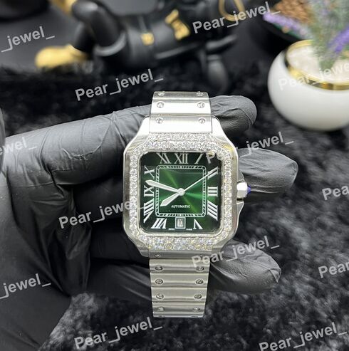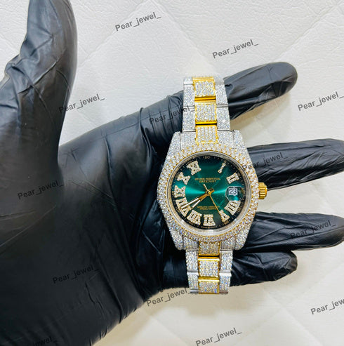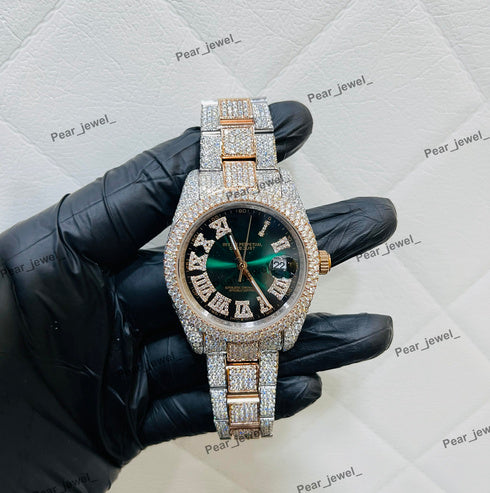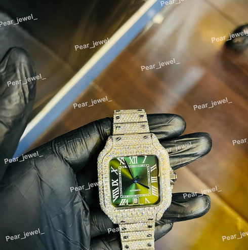 Luxury Iced Out Stainless Steel Green Dial Wrist Watch For Man