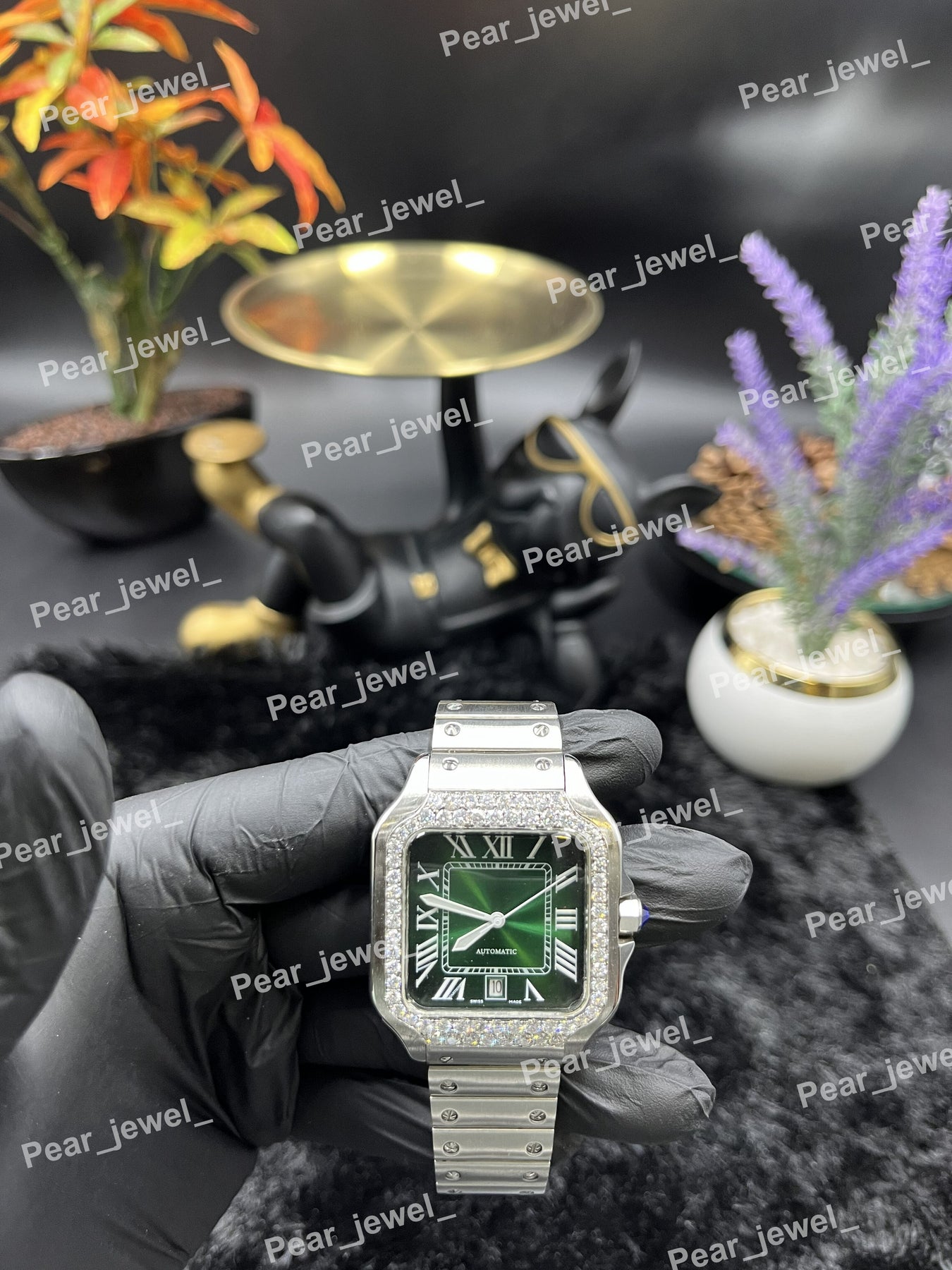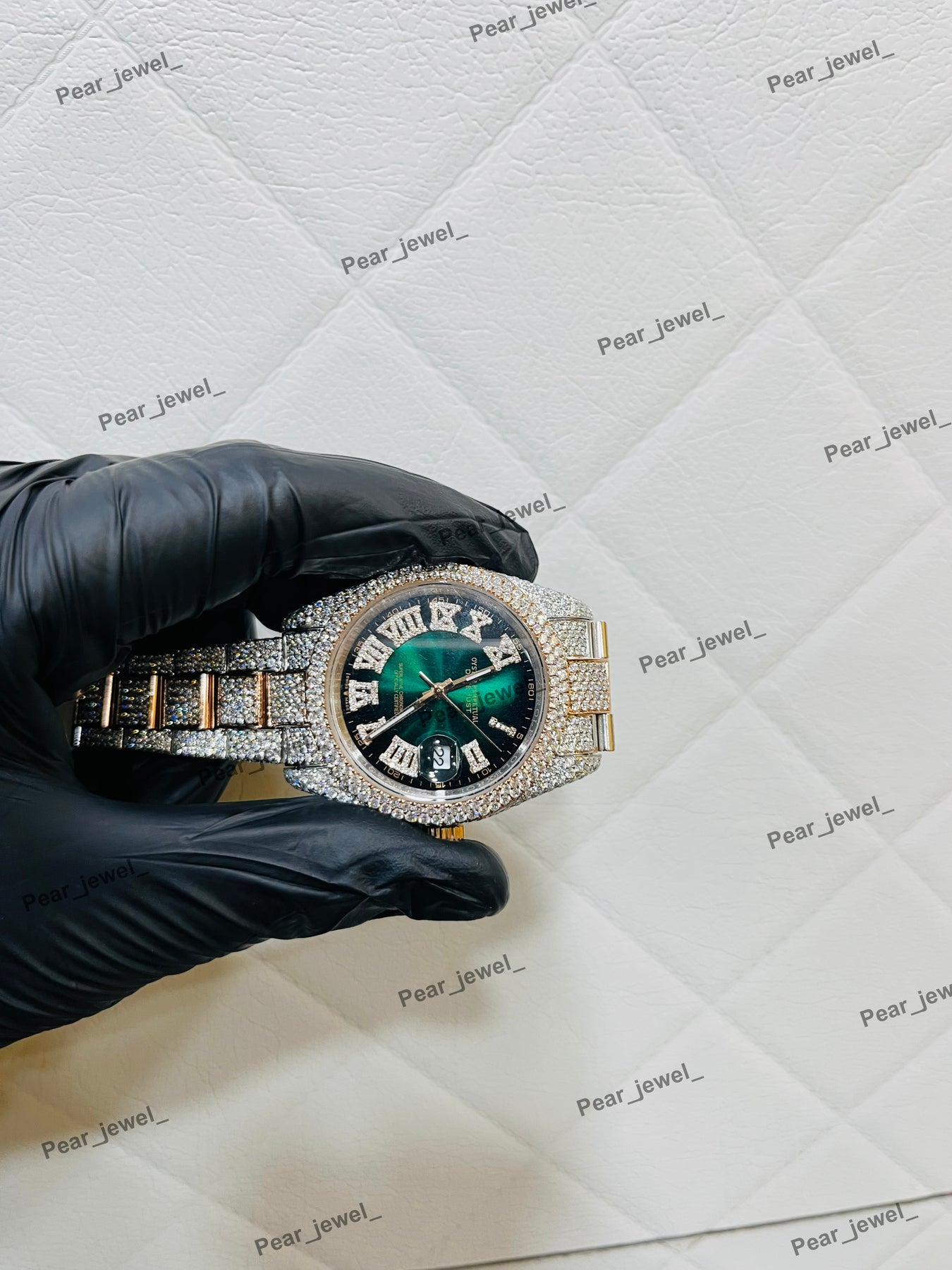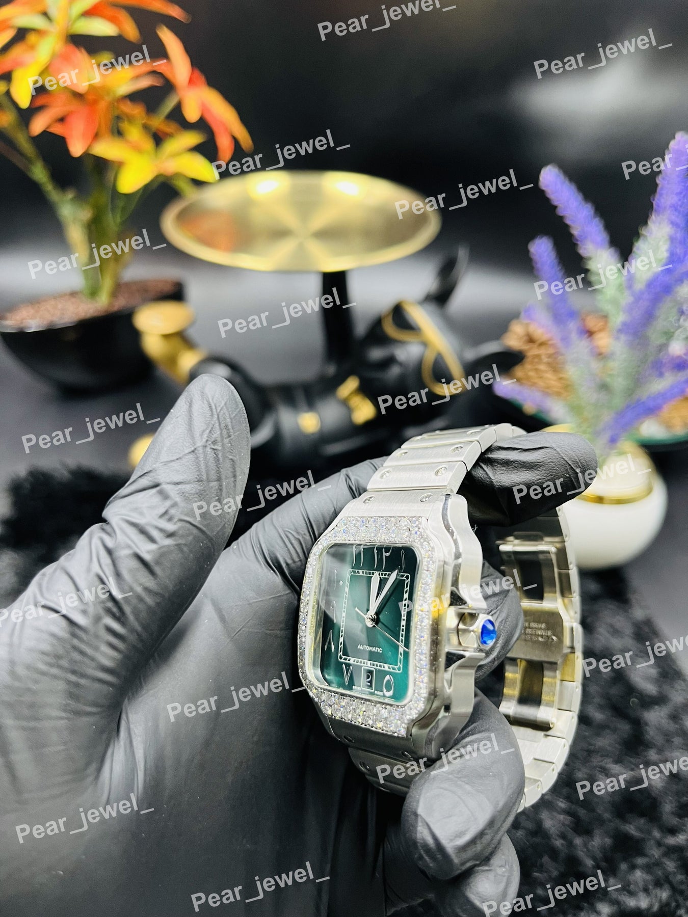 Luxury Iced Out Stainless Steel Green Dial Wrist Watch For Man