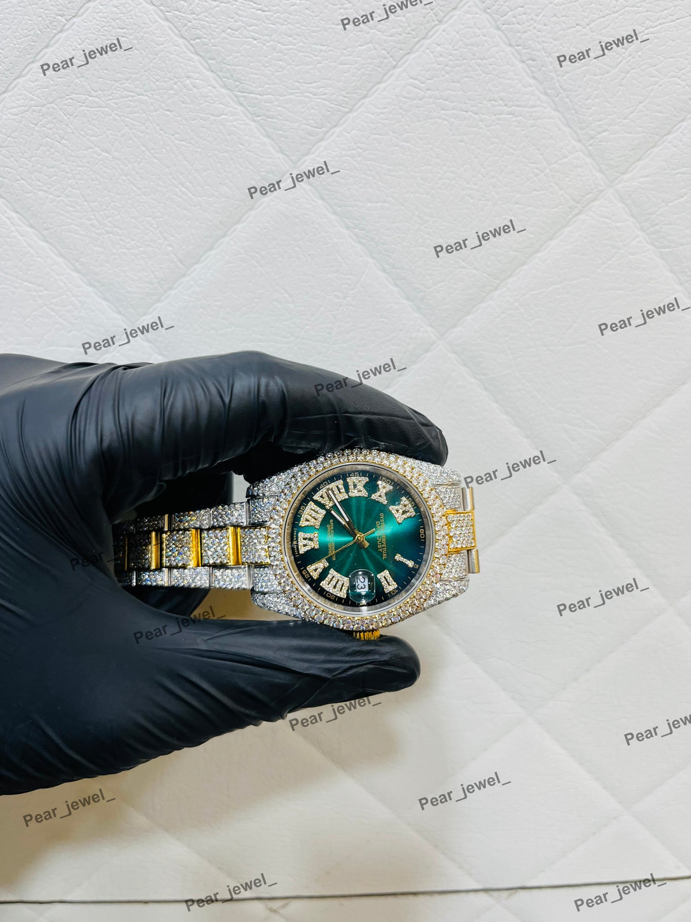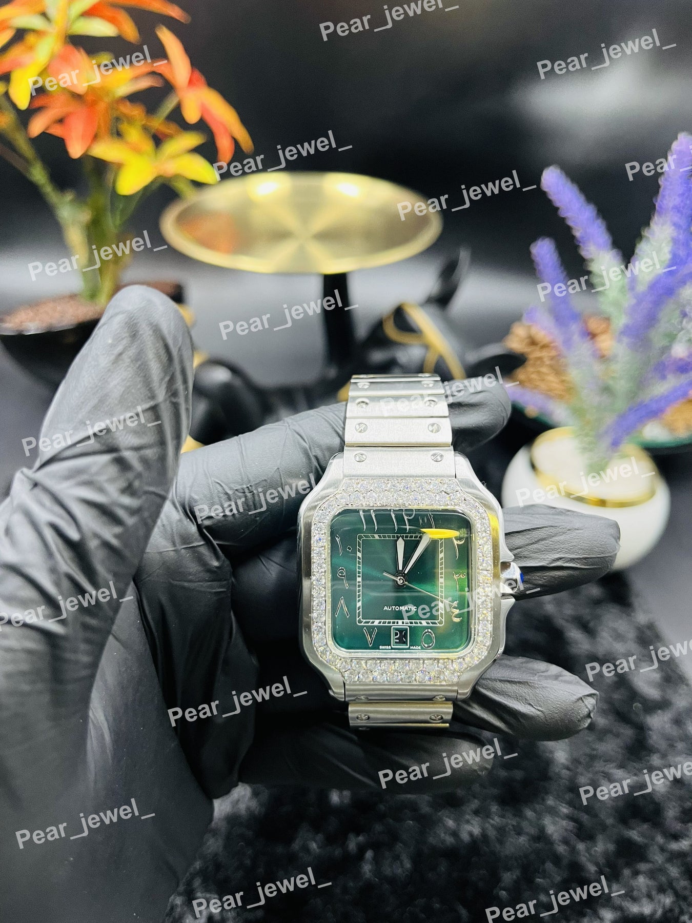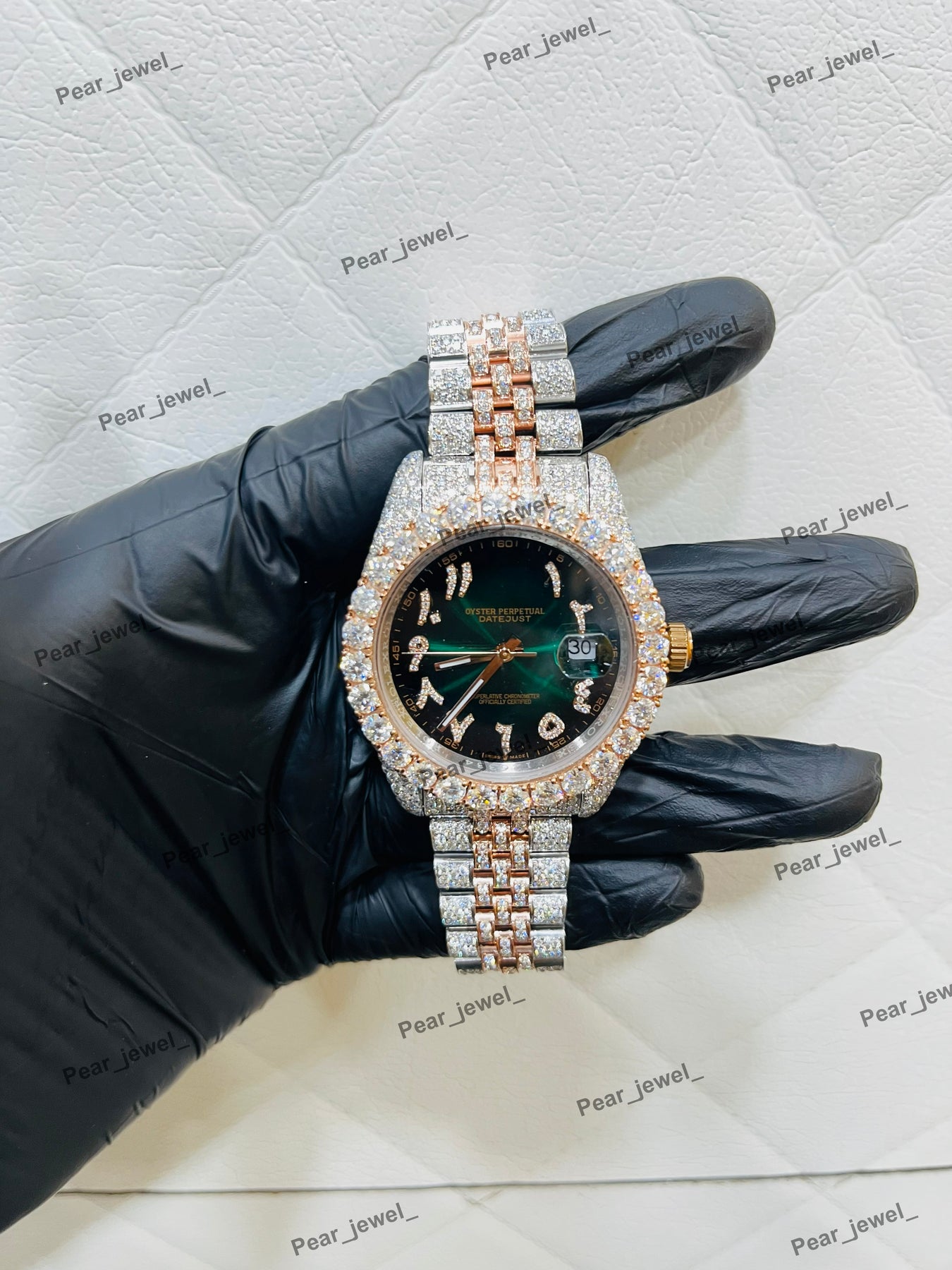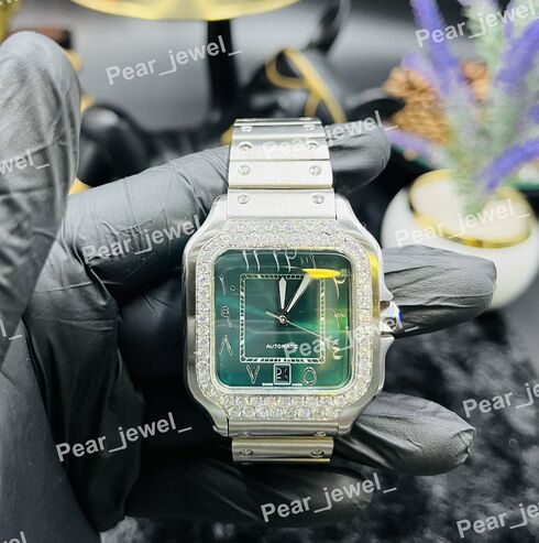 Iced Out Moissanite Diamond Hip Hop Luxury Watch Green Dial Date Arabic Stainless Steel