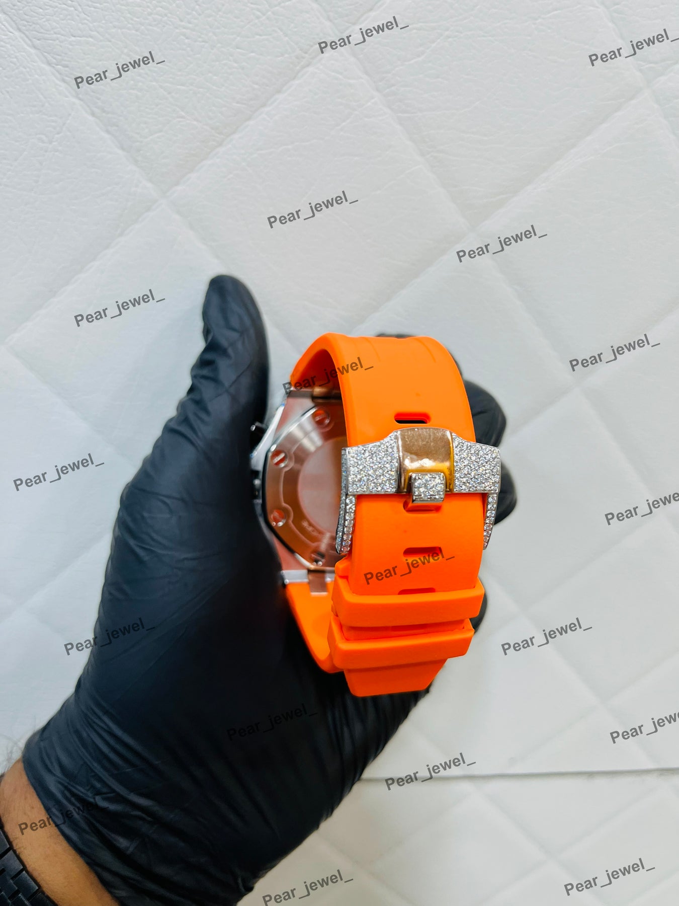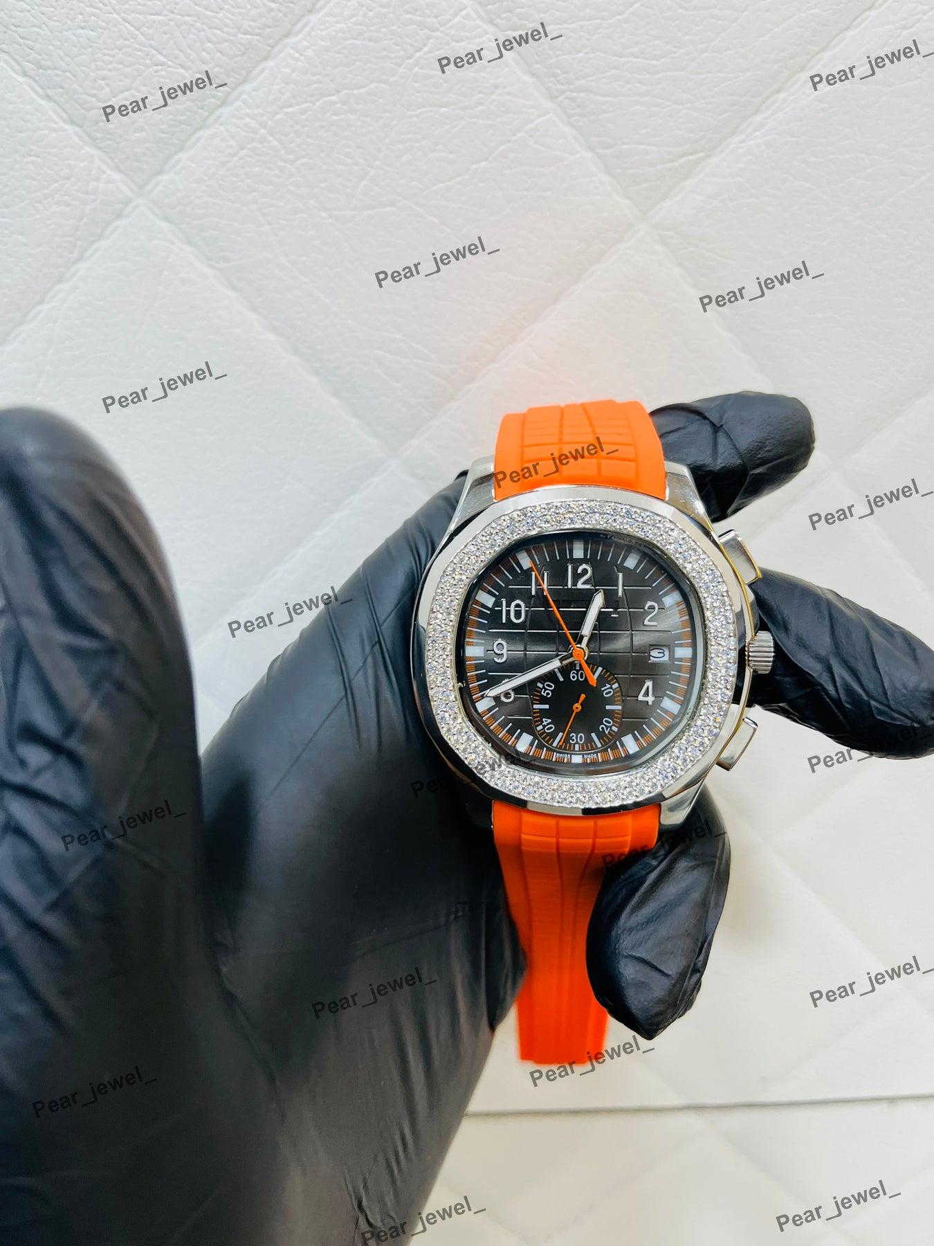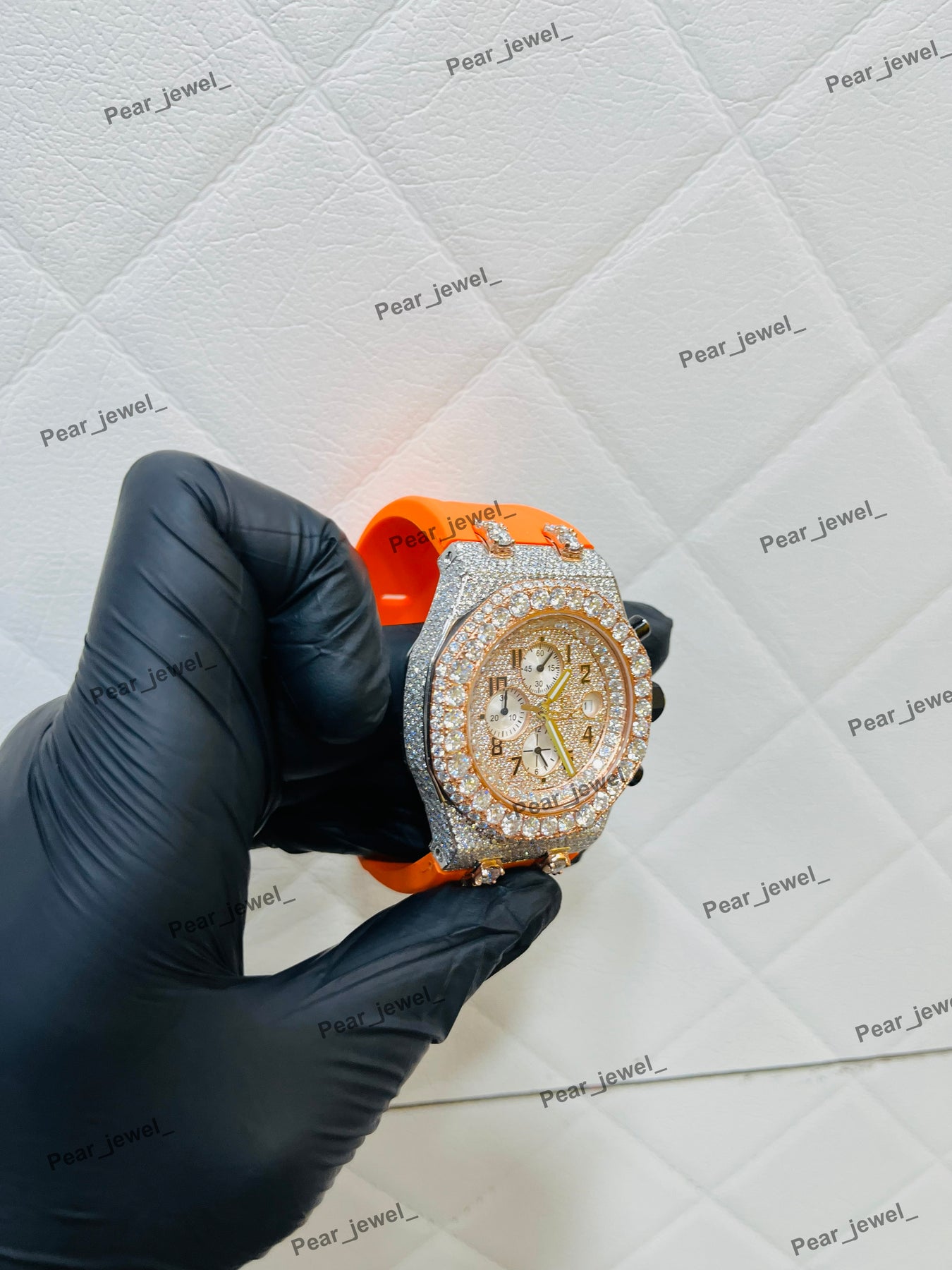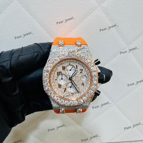 Iced Out Moissanite Daimond Bezel Sport Watch Orange Strap Steel
