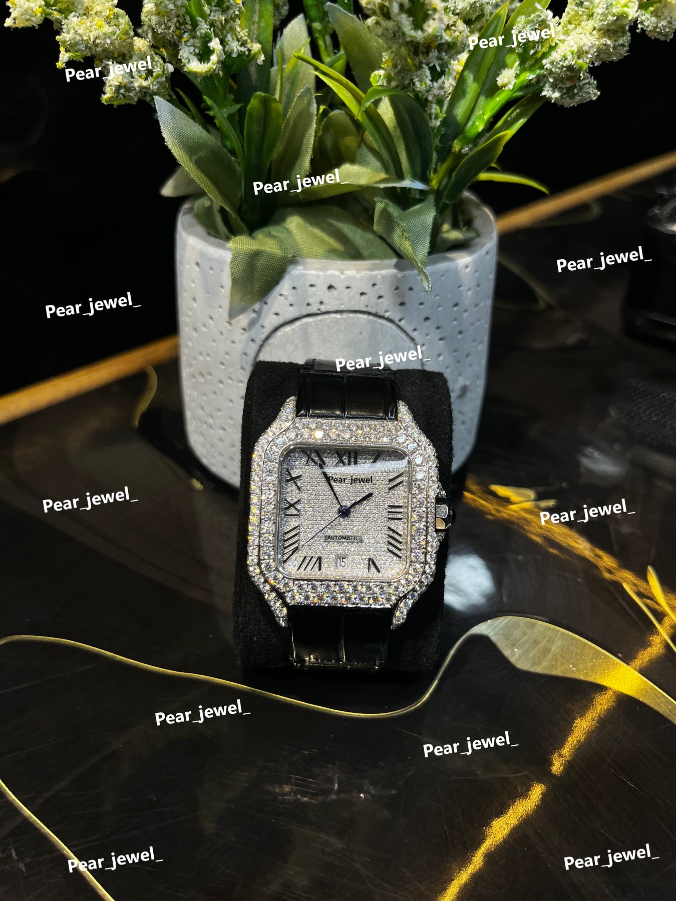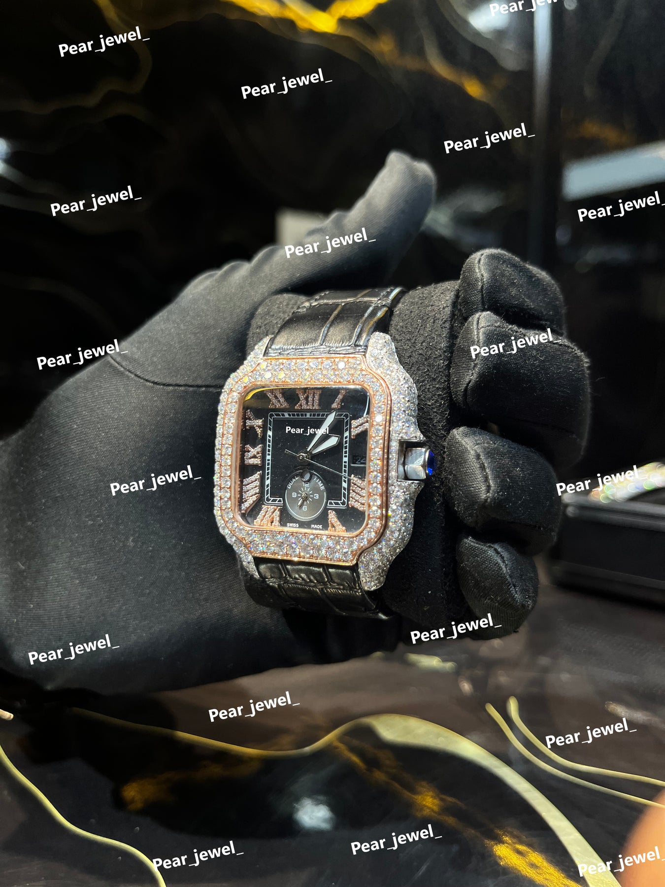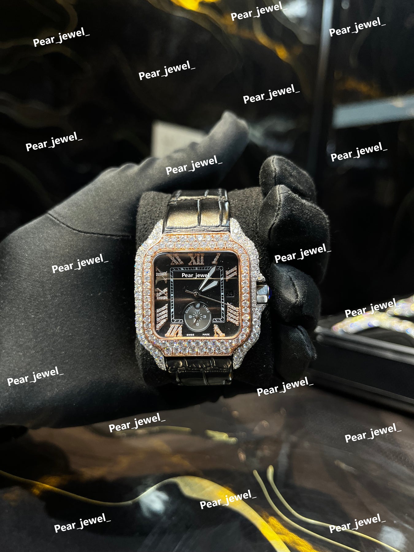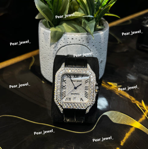 Iced Out Square Black Dial Watch Moissanite Diamond Leather Strap