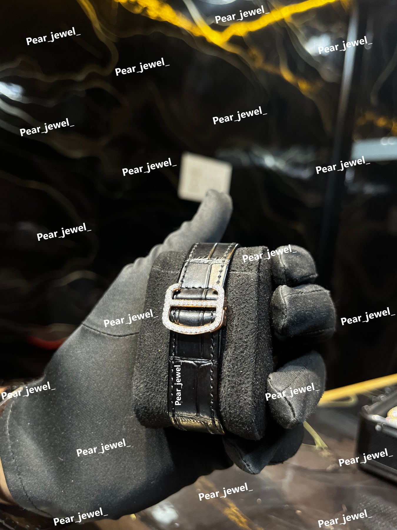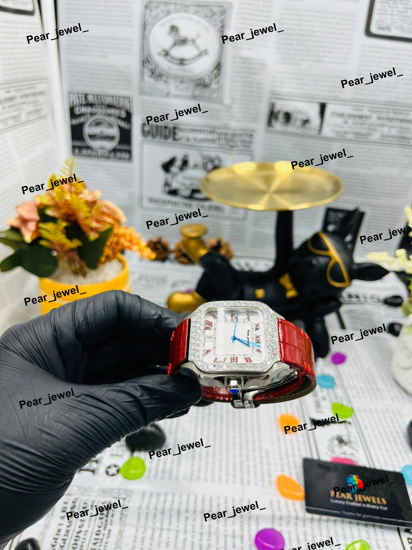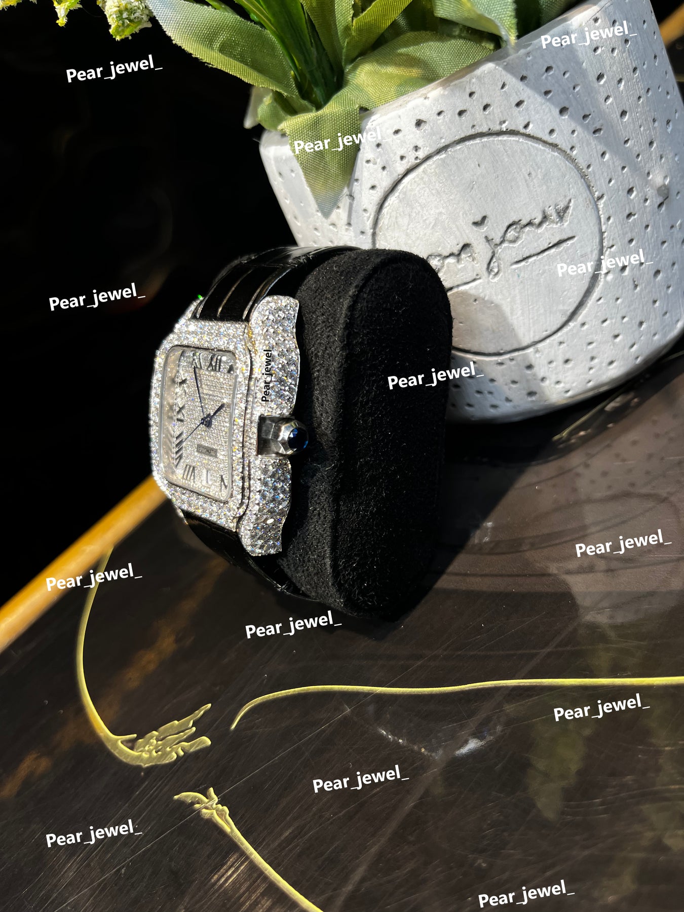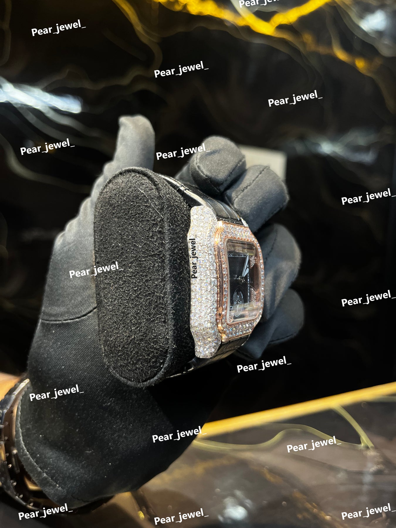 Iced Out Square Black Dial Watch Moissanite Diamond Leather Strap