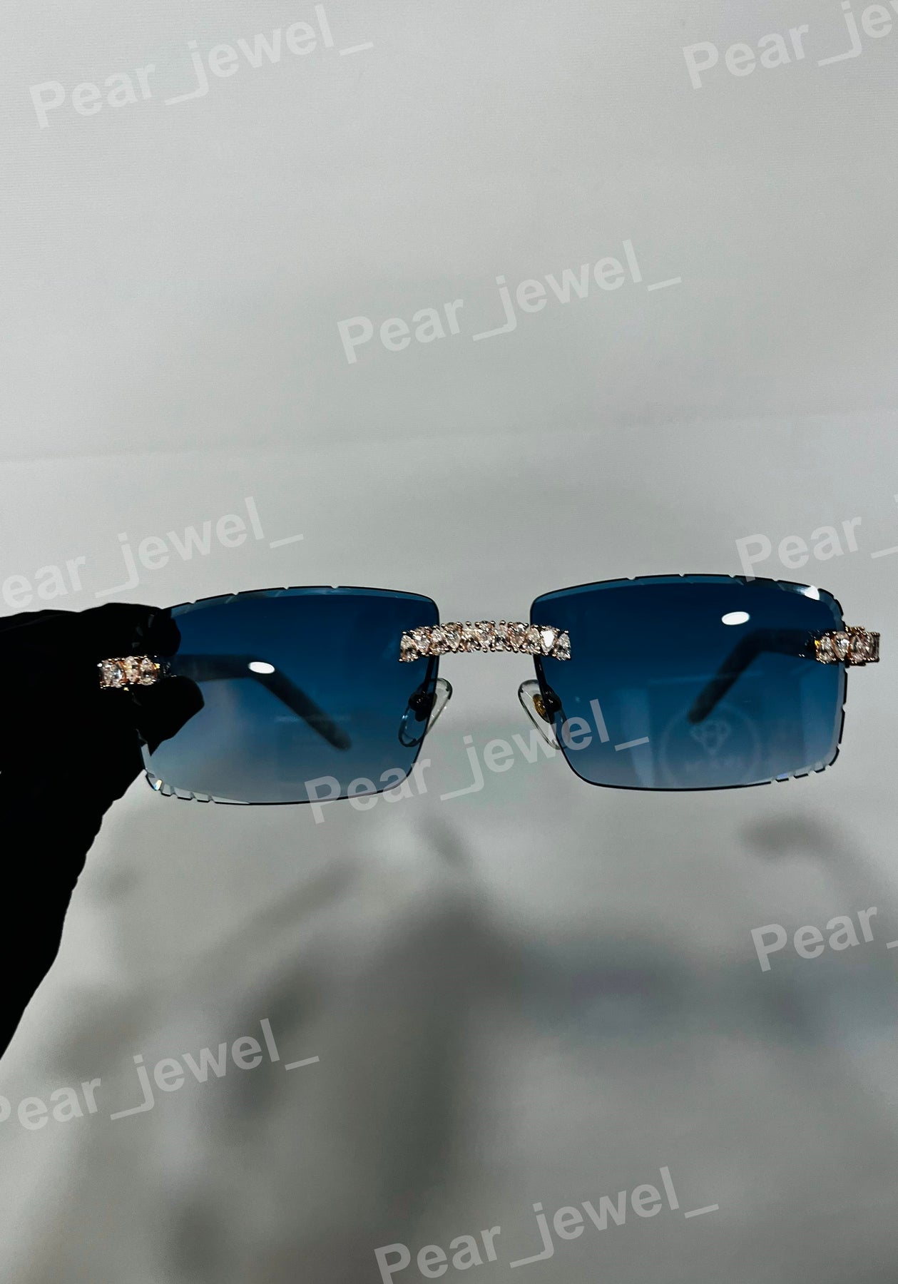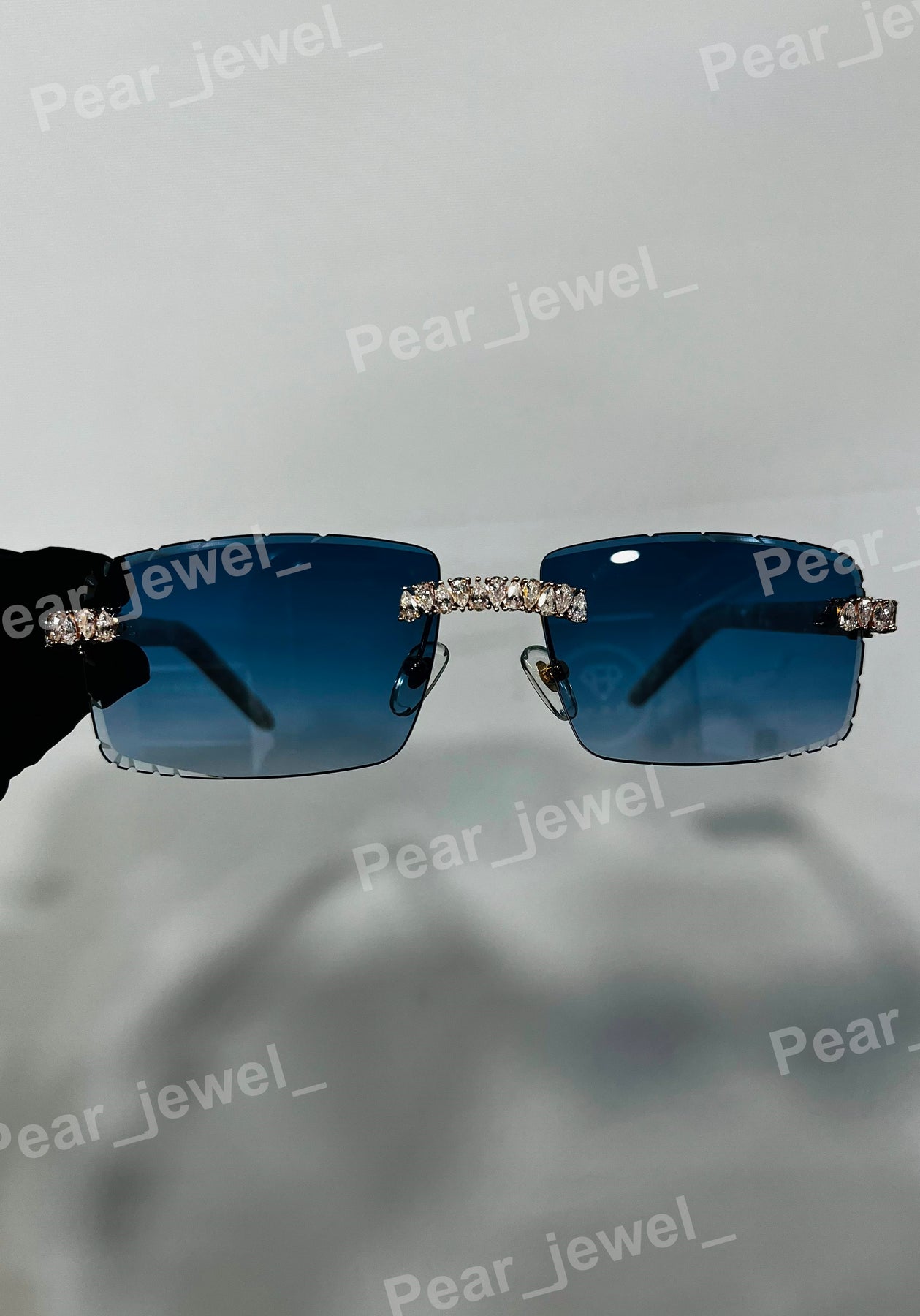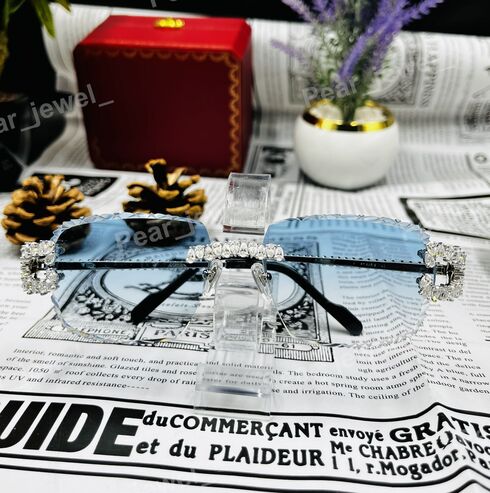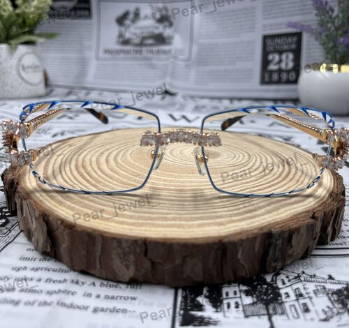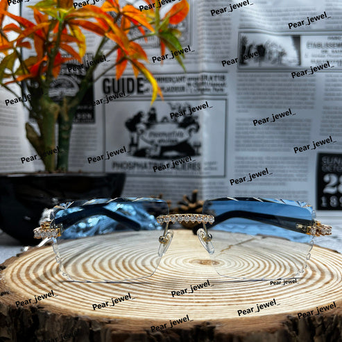 Iced Out Silver Rimless Sunglasses Moissanite Diamond Blue Glasses