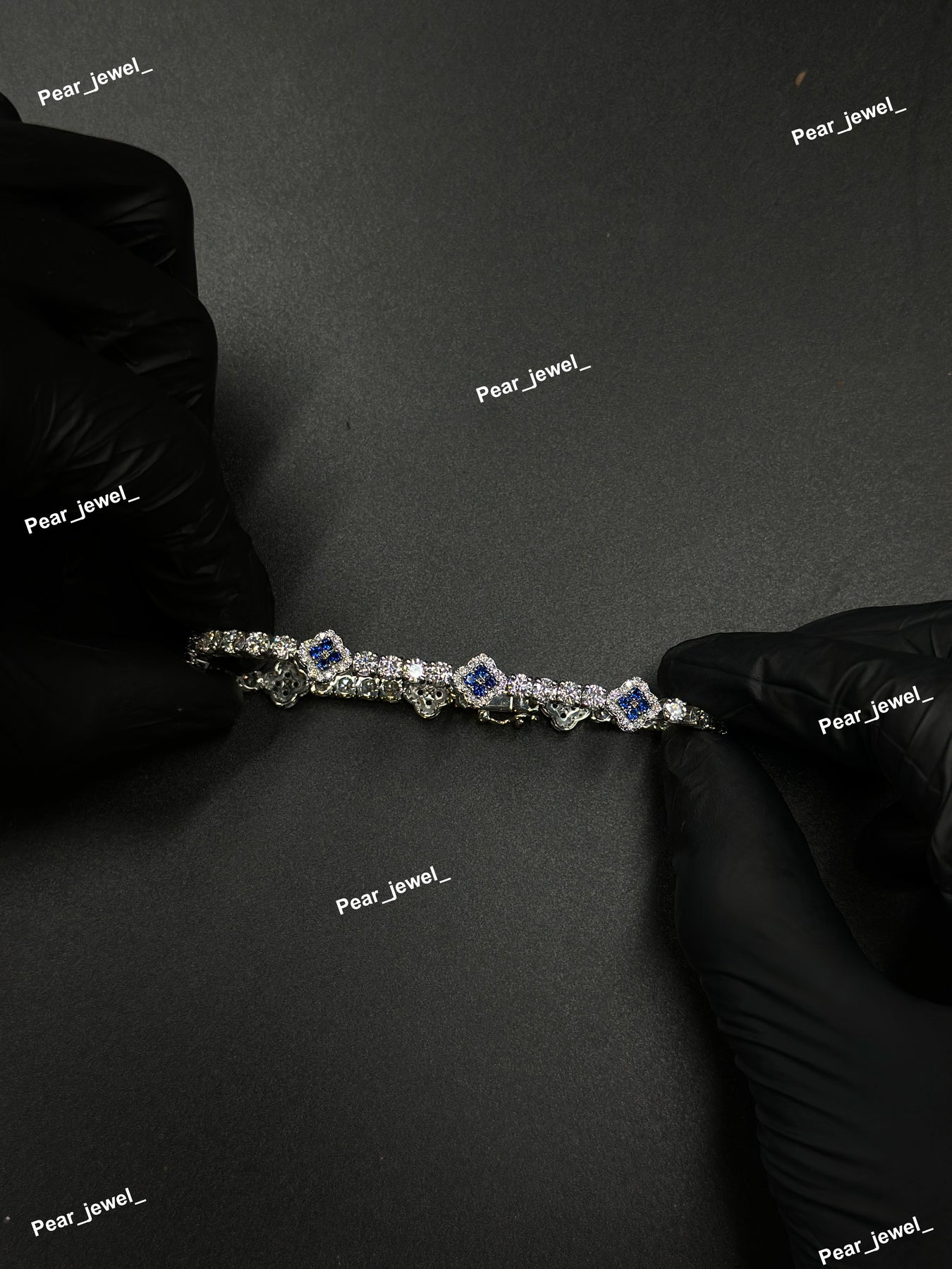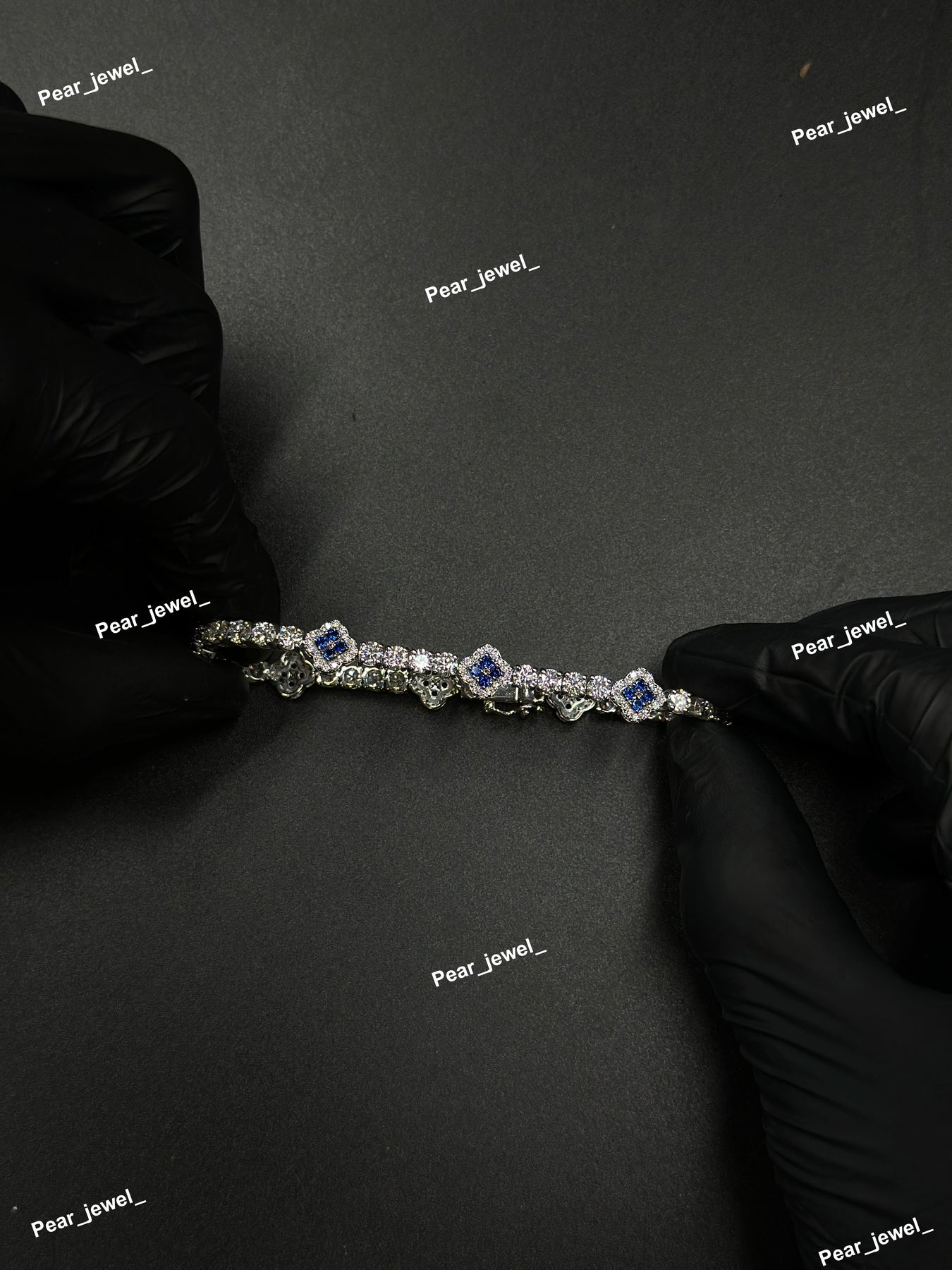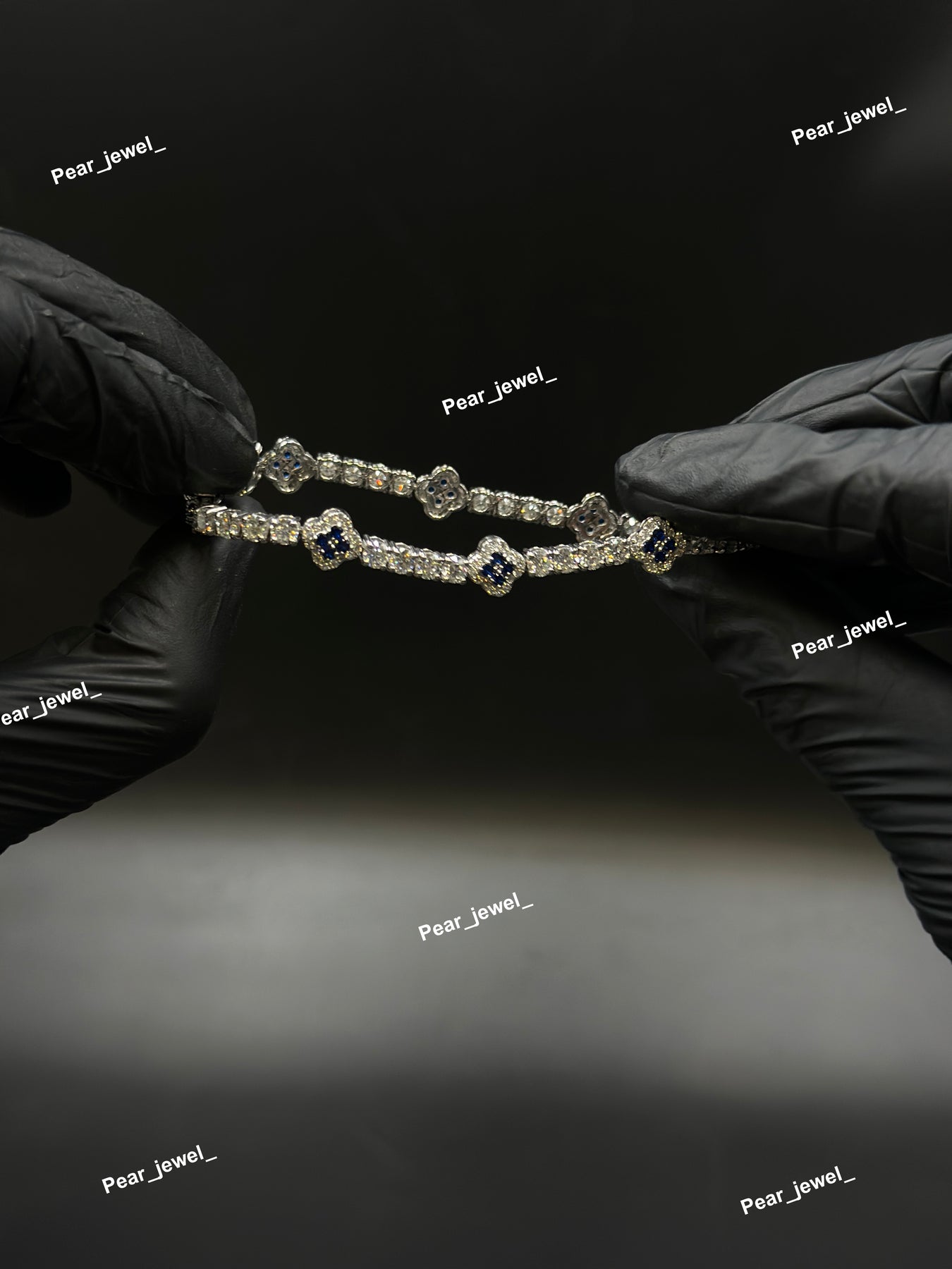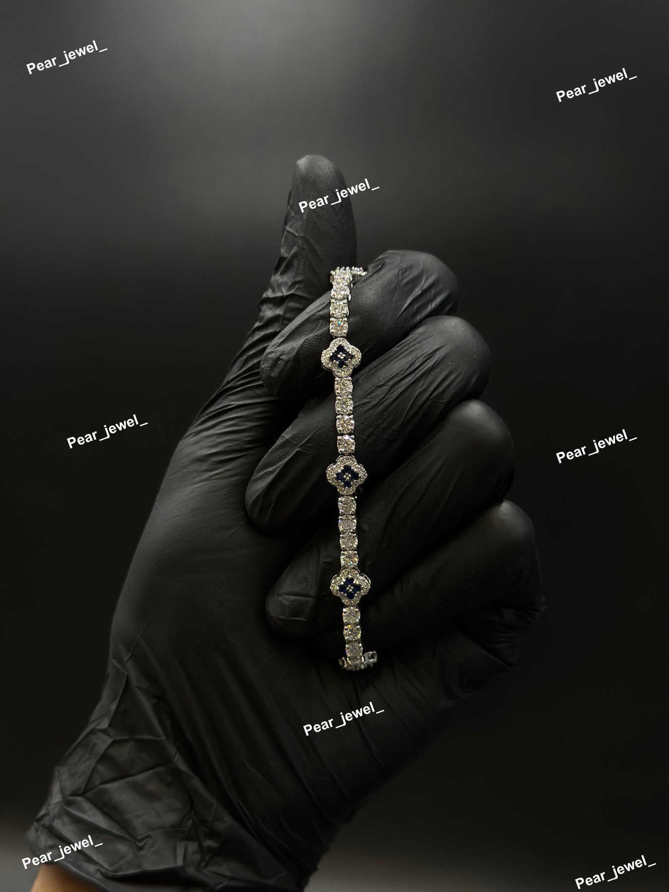 Dark Blue Accent Iced Out Clover Tennis Bracelet VVS Moissanite Dimaond Silver Shine