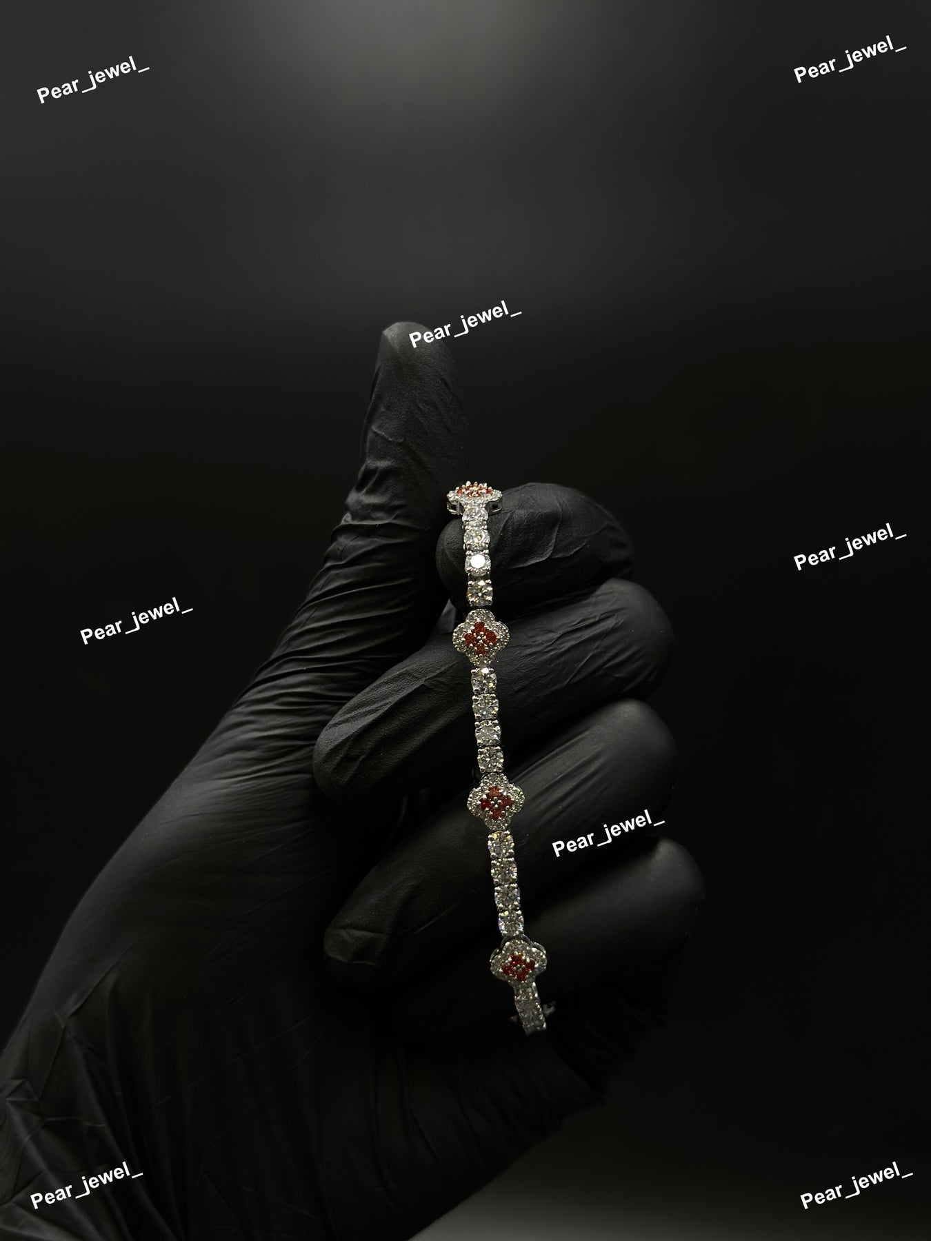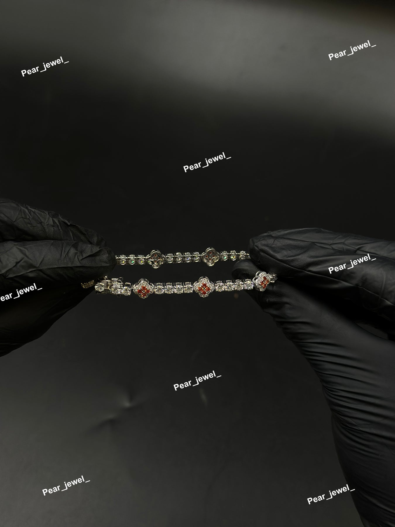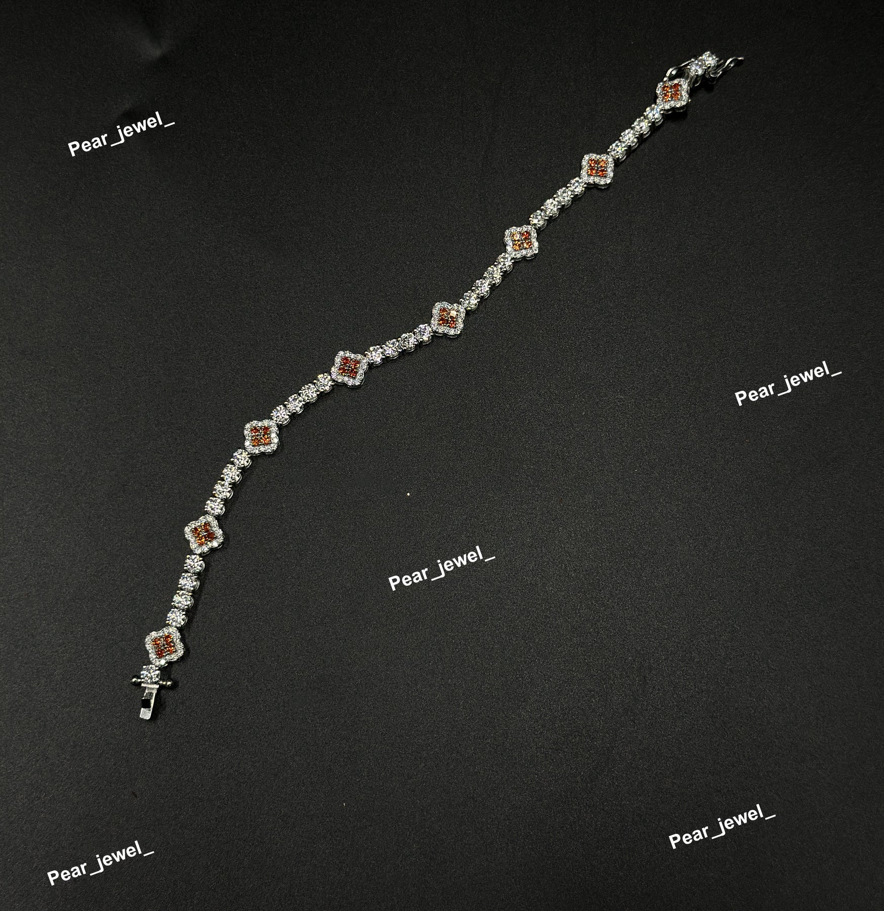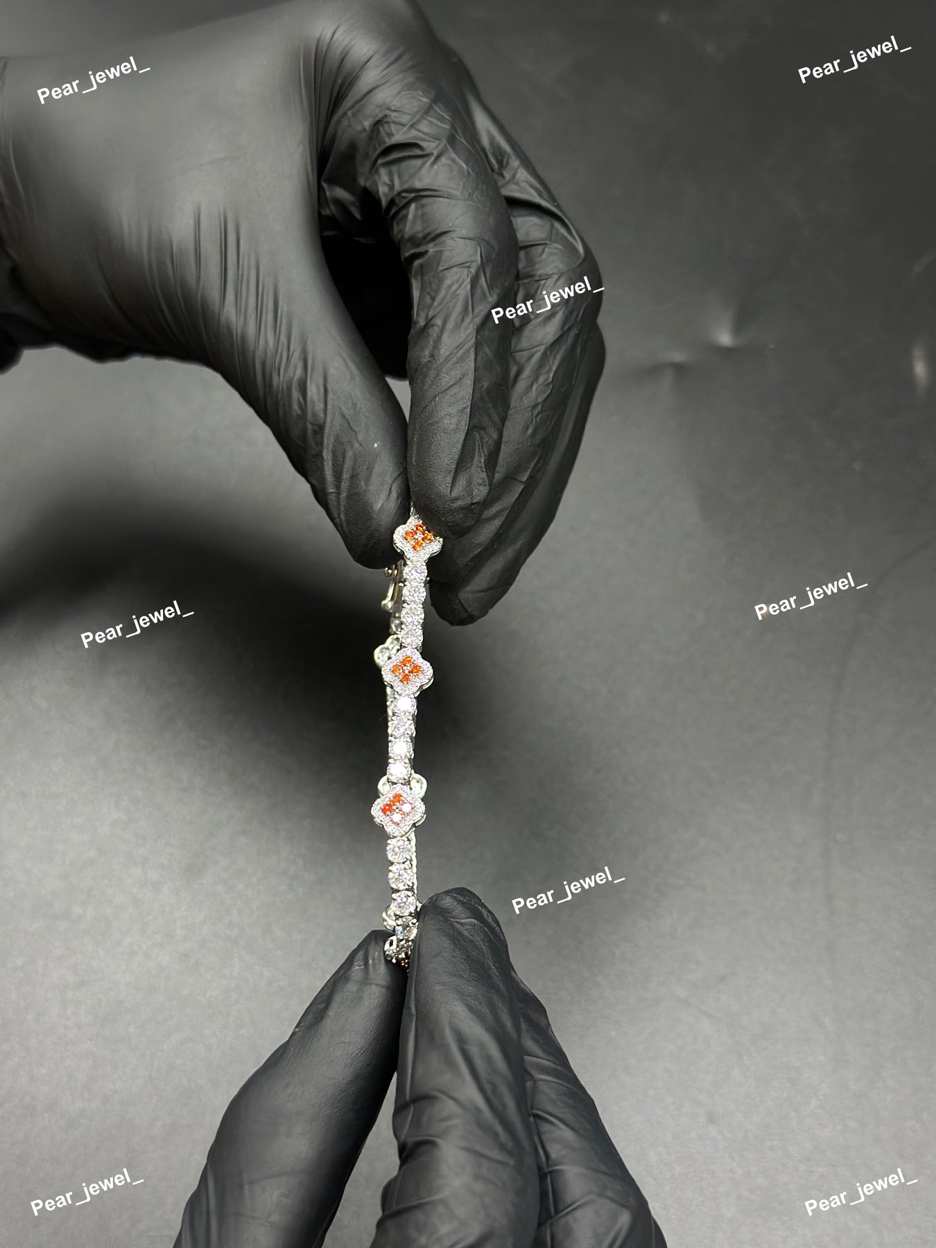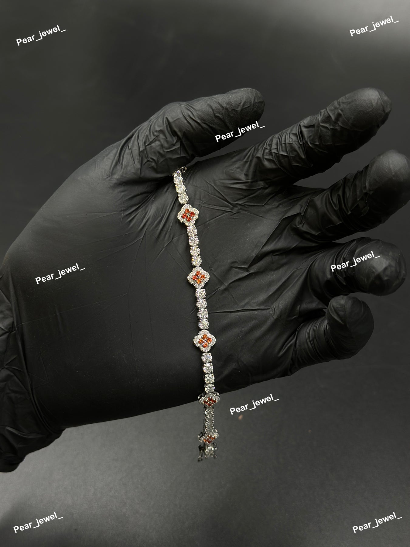 Orange Accent Iced Out Clover Tennis Bracelet Moissanite Diamond Look